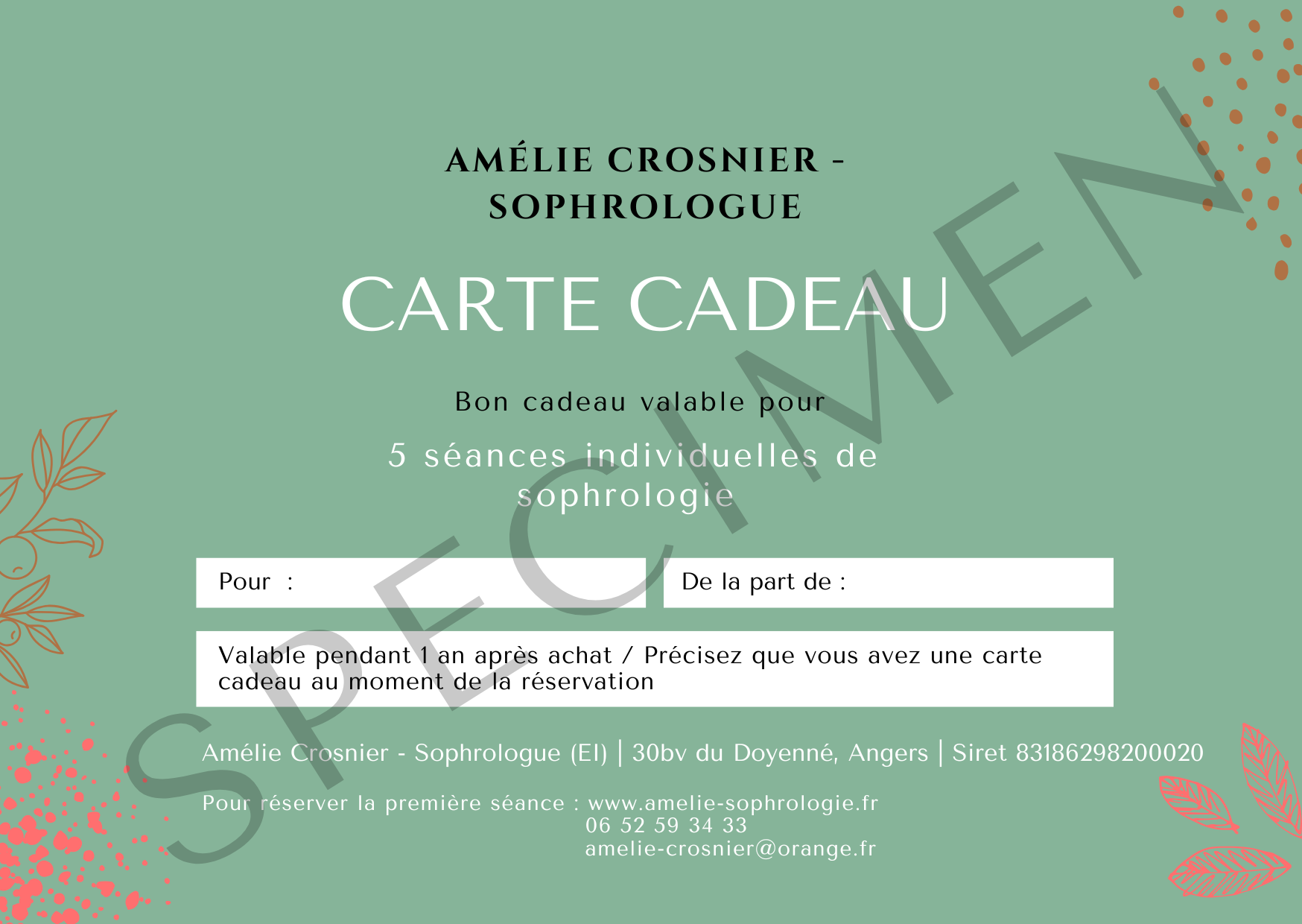 Pour réserver la première séance, il suffit de me contacter par mail ou téléphone (coordonnées indiquées sur la carte cadeau) en précisant qu’il s’agit d’un bon cadeau.